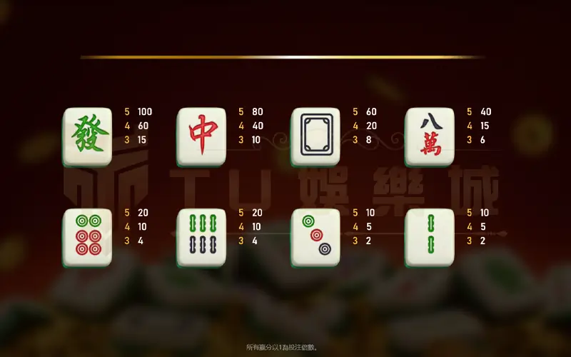 麻將發了總共有八種獎金符號,有發財、紅中、白板、八萬、六筒、六條、三筒、二條以及百搭符號。
